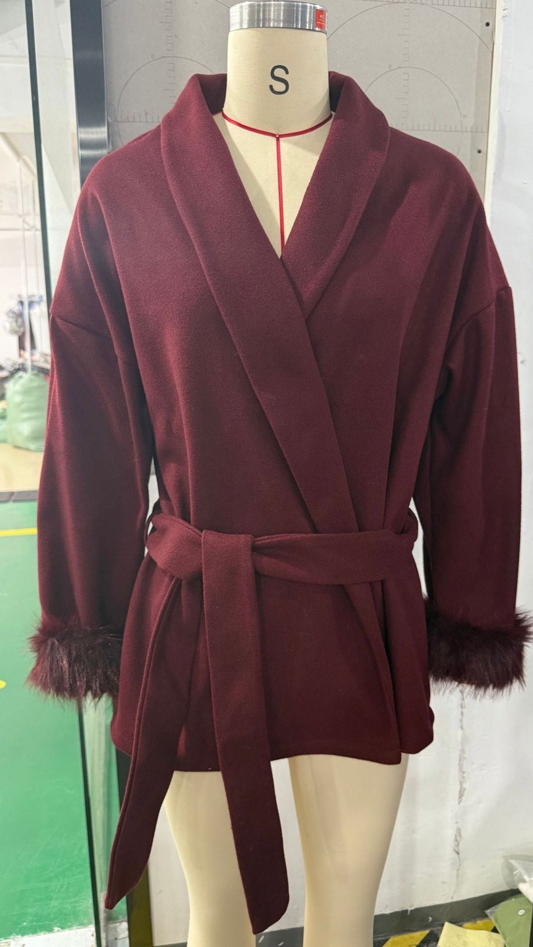 Elevate your wardrobe with this chic and sophisticated coat. Designed with a modern straight cut, it ties at the waist with a flattering belt that highlights your silhouette. The sleeves are finished with plush faux fur cuffs, adding a luxurious and cozy touch.